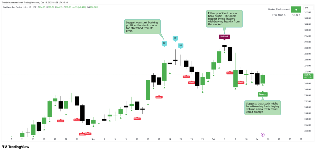 1. Added signals for buying/holding, and strategic labels like “Bounce”, “Pullback”, “Shakeout”, and “Book Profit (That Sky blue label with “BP” written in it.)”
